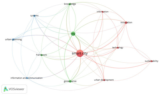 - Cluster 1. It is represented in red color, and comprises a total of six items (information, innovation, smart city, sustainability, technology, and urban development).