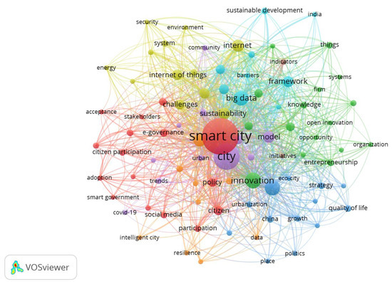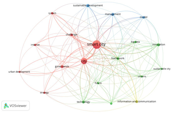 A total of 80 articles were published in this period, with a total of 410 keywords, since some of them were similar, for example, “smart city” and “smart cities”. A data cleansing process was performed. These similar words were considered in the analysis by creating a VOSviewer thesaurus file with the replaced words (Table S2). As a result, of the 410 initial words, 393 were analyzed.