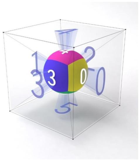 The cube map conversion process reflects the image on each side of the photosphere (represented by the color sphere in the center) to the nearest side of the cube to minimize distortion in the final result of the flattening process [46]. The sphere was divided into six parts and the numbers represented the order of each part of the sphere that reflected the corresponding cube side.