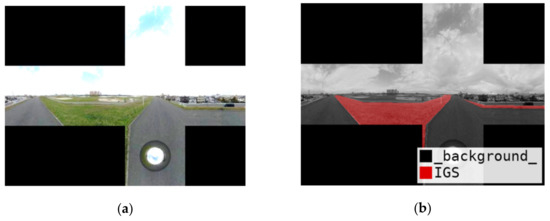 Images processed by Labelme. The source image (a) was marked in all IGSs using the Labelme program and saved as a JSON file. (b) Visualization of the result, with the red zone representing IGSs and grey and black representing other areas.