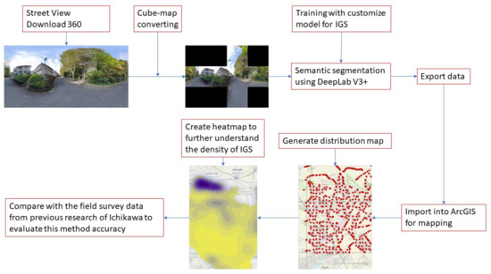 A total of 24,553 GSV images were downloaded from Street View Download 360 using a network of interval points along the road to detect the IGSs. The novel model proposed in this study for DeepLab V3+ was constructed from 1000 manually labelled pictures to recognize and mark IGSs in the GSV data. The IGS distribution maps and density heatmaps were produced from the output data from DeepLab V3+ using the ArcGIS software. This method produced results consistent with the previous fieldwork, required less effort, and could be performed automatically in any country. Therefore, this method can reduce the human risk and research costs compared with traditional field survey methods.