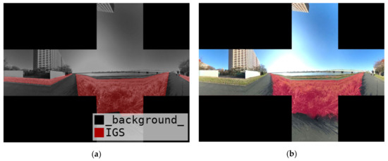 The process was modified based on the application to improve the accuracy and generate detailed results. Compared with the method proposed [31], this study included the cube map conversion before the training model and segmentation steps. As a result, the bending effect along the edges of the photos was reduce drastically. DeepLab V3+, which used a model created with 1000 photos, gave an accuracy rate of approximately 0.65 for the designated samples. This result indicated that the new model’s accuracy had a ~65% match with the masked (labelled) image given in the training process (Figure 7). This means the program can detect IGSs in the photos, although in some cases, it will mistake objects of a similar size (small), shape (oval, rectangular, triangle), or color (light green to dark green) as IGSs, and it may overpass the IGSs in some photos.