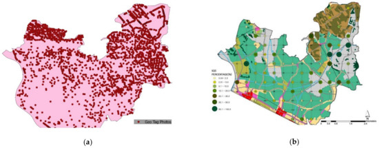 A distribution map from a study on the distribution of IGSs in northern Ichikawa in 2020 [26] generated from field survey data was used as a comparison. The map was obtained from an assessment of the typology of and perceptions of local residents about IGSs. A grid net of 500 m × 500 m was established with sample sites of approximately 2500 m2 at each intersection along northern Ichikawa, and the mail-back kit was distributed in those sample sites. Each mail-back kit included a questionnaire survey and a brief explanation (with pictures to visually identify) about IGSs. A total of 120 sites were surveyed, and data on the land use, morphology, and vegetation were collected (Figure 8b). The IGSs were found to cluster around two main areas, namely the east and west of northern Ichikawa, but were scattered in other areas.