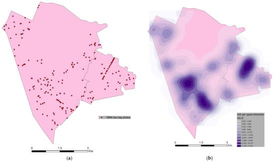 In the TBPN districts of HCMC, 204 spots were detected to have IGSs from a total of 9124 photos downloaded from the Google server (Table 1). The distribution map of the IGSs revealed the average density, i.e., 9.9–14.9 IGSs per km2, with primary concentrations in the eastern, southern, and northwestern parts. Of note, the central and northern parts did not have any IGSs, except for a few spots at the surrounding edges (Figure 10a). This decreased rate was caused by several factors, including the many low-resolution, mislocated, nighttime, and indoor photos, making it difficult for the program to accurately recognize the objects in complex scenes. As depicted in the map in Figure 8a, IGSs can be detected in all districts, except a large area in the north of Tan Binh district, at the Tan Son Nhat International Airport, which restricts people’s access. Another notable characteristic of the distribution of IGSs in TBPN is the straight line of IGSs east of the maps, which belongs to the Phu Nhuan district. IGSs exist on the side of the railway named the “railroad verge” [17,19]. The heatmap generated from the data derived using the same method as the Ichikawa case provides a clear view of the density of IGSs in the TBPN district. However, Ichikawa has density values ranging from 1 to 167 IGSs per km2, while the TBPN district has IGS density values ranging from 1 to 25 IGSs per km2, nearly seven times less than Ichikawa (Figure 10b).