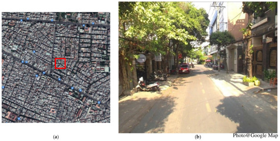 Differences in viewing perspectives in the same place in HCMC: (a) aerial view on Google Earth and (b) pedestrian view provided by GSV.