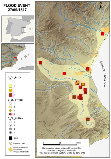 The results obtained from this classification are used in studies aimed to identify and characterise patterns of climate variability within the Little Ice Age. It only uses information related to relevant geographical locations, such as large cities or areas with significant infrastructural elements. For these locations, chronologies of flood events are established and their frequency is analysed. Countless projects have been generated for different European regions and river basins under this pattern, and as more information has become available, new updates have been generated, as in the case of the Spanish Mediterranean River Basins [,,,]. Recent works are proving that the methodologies used on a continental scale were consistent with the projects to characterise floods in Europe during the 16th century [], or the most recent example using dozens of chronologies for Europe for the last 500 years [].
