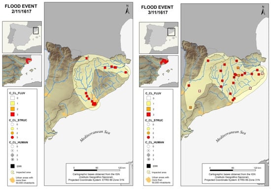 (Left): Representation of cases for the flood event of 2 November 1617. (Right): Representation of cases for the flood event of 3 November 1617. C_CL_FLUV: Variable 1. Hydraulic behaviour of the river flood. C_CL_STRUC: Variable 2. Flood impact on structural elements. C_CL_HUMAN: Variable 3. Social/personal vulnerability to the flood. ERR: Erroneous or spurious cases. Blue line: Basic fluvial system. Black line: Spanish Hydrographic Demarcations. Urban areas: Population according to 2022 demographic record.