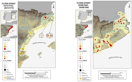 The episode selected for the 19th century is the one known as “Aiguat de Sant Bartomeu” on 23 and 24 November 1842. This episode affected a total of three Hydrographic Demarcations, causing 57 flood cases. Its affectations were mainly distributed along the coastal area of the Internal Catalan Basins (Catalonia) and the Pyrenean River Basins that run through France (Figure 3, right). This episode is notable for having a few flood cases whose impact on structures was lower than in other episodes. On the other hand, the impact on the population was more significant, causing fatalities in many parts of the affected area.