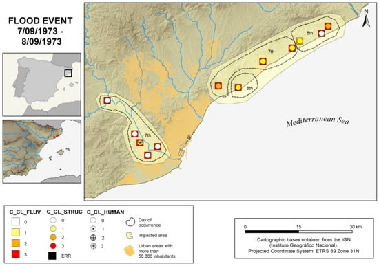 A relevant aspect of the case indexing system (Ic) is that it allows the information on the different variables (multivariable) involved in its definition to be kept segregated. This prevents the loss of detailed information for subsequent research or analysis. This segregation is not easy to manage, but its usefulness takes precedence. The proof of this complexity is the cartographic representations generated for specific episodes. The amount and diversity of information presented has required the design of a rather complex to read symbology. However, it preserves and shows nuances for each of the variables, a positive factor in the overall analysis of the flood episodes.