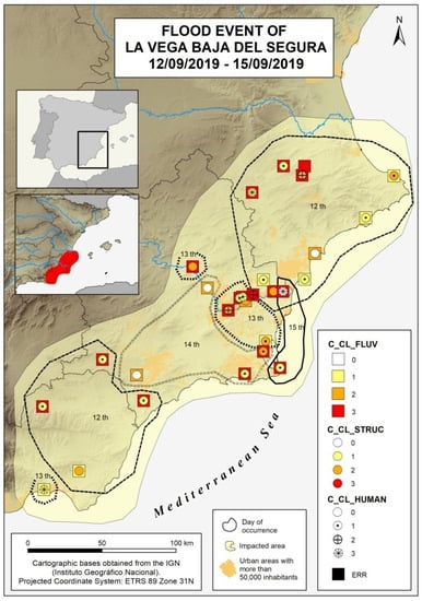 Representation of cases for the flood event of 12 to 15 September 2019. C_CL_FLUV: Variable 1. Hydraulic behaviour of the river flood. C_CL_STRUC: Variable 2. Flood impact on structural elements. C_CL_HUMAN: Variable 3. Social/personal vulnerability to the flood. ERR: Erroneous or spurious cases. Blue line: Basic fluvial system. Black line: Spanish Hydrographic Demarcations. Urban areas: Population according to 2022 demographic record.