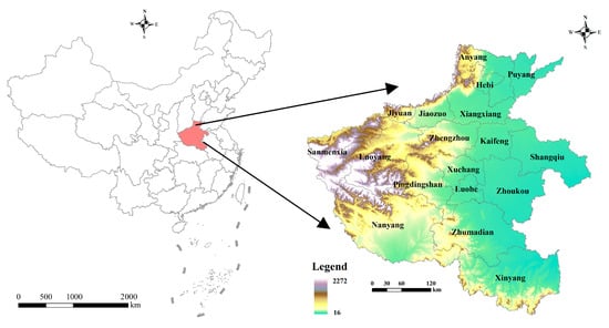 Henan Province is located in central China, with a high topography in the west and a low topography in the east. The western, northern, and southern parts are mainly mountainous and hilly, while the eastern part is flat and low and dominated by plains (Figure 1). The land area is about 167,000 km2, of which mountains and hills account for 44.3% of the province’s total area, while plains and basins account for 55.7%. Henan Province has experienced rapid economic development in recent years, with an average annual GDP growth of 7.1% from 2012 to 2022, and the province’s economy accounts for 5% of the country’s total []. The externalities caused by the massive amount of carbon emissions from economic development have triggered apparent environmental injustice. Henan Province has taken measures to solve environmental injustice, including returning farmland to forest and protecting natural forests, which have achieved certain effects. However, there are still problems, such as the target being challenging to achieve and limited compensation. With the implementation of two national strategies, namely the rise of central China and the ecological protection and high-quality development of the Yellow River basin, higher requirements have been put forward to promote coordinated regional development, optimize regional development pattern, and alleviate environmental injustice.