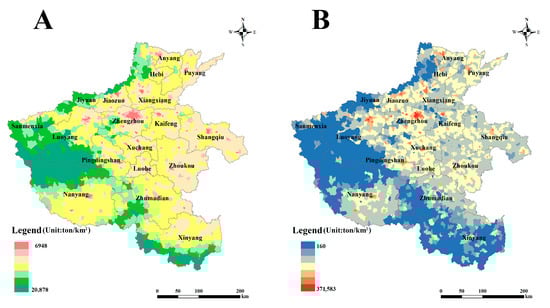 Spatial distribution of carbon sequestration supply and demand ((A) and (B) are CS supply and demand, respectively).