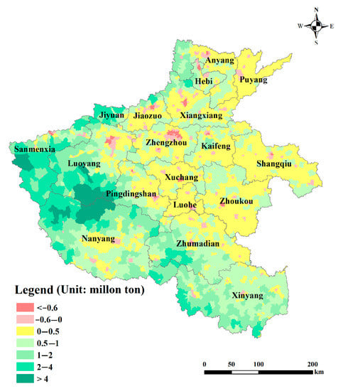 The 2018 land-use data were from China’s National Land Use and Cover Change (CNLUCC), with a resolution of 30 m. CNLUCC used Landsat remote sensing image data as the primary information source, which were obtained through visual interpretation, which was the most accurate land-use remote sensing monitoring data product in China []. The data included six primary types: arable land, forest land, grassland, water, construction land, and unused land. Population density data were from the WorldPop dataset with a resolution of 100 m. The population density data published by WorldPop were the most accurate and reliable long-time series data among the current mainstream population density maps in the world and were used by many international organizations []. China’s 2018 carbon emission per capita data are from the Emissions Database for Global Atmospheric Research (EDGAR) (https://edgar.jrc.ec.europa.eu/ accessed on 6 May 2021). EDGAR, because of its high citation rate and influence on the world carbon database, has become an authoritative reference material for scientific research and education, and is also the official data source for the International Panel on Climate Change’s Fifth Assessment Report []. The Chinese domestic carbon emissions trading pilot market price (23.5 CNY/ton) was obtained from the China Carbon Emissions Trading Network(http://www.tanpaifang.com/ accessed on 22 April 2021), a vertical portal for China’s carbon emissions trading industry. Engel coefficients were from the Statistical Yearbook and the 2018 Henan Provincial Consumption Development Report [].