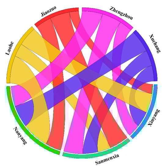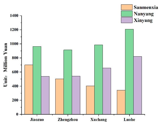 Figure 6 illustrated the spatial flow of CS from different ECRAs to ECPAs. Sanmenxia had a large CERF for Jiaozuo and Zhengzhou and a small one for Luohe. Nanyang and Xinyang had the greatest CERF for Luohe and the least for Jiaozuo. Nanyang had the largest CERF, total ecosystem services flowing to external regions, and the highest ecological contribution to ECPAs. In addition, the study found that the outflow of ecosystem services from different ECRAs mostly decreased with increasing distance. Depending on the ecosystem services flow, the study also calculated separately ecological compensation amounts paid by ECPAs to ECRAs. The results showed that all four cities paid the highest ecological compensation to Nanyang (Figure 7). Besides Jiaozuo, Zhengzhou, Xuchang, and Luohe paid the second ecological compensation to Xinyang. Jiaozuo paid the least to Xinyang. Nanyang received the highest ecological compensation funds, amounting to CNY 4.069 billion. Sanmenxia and Xinyang also received CNY 1.948 and 2.556 billion, respectively.