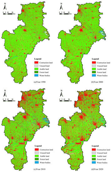 From the land use structure perspective, arable land continues to decline from 83.2% in 1990 to 67.3% in 2020 but remains the largest land use type in the TWL region. Construction land had a 121.6% rapid increase from 1990–2020, from 11.4% in 1990 to 25.2% in 2020. Although the change rate is larger, the forest land and the water bodies show a lower proportion. Unused land remains the lowest among all the land use types and varies from 0.001–0.3% (Table 2).