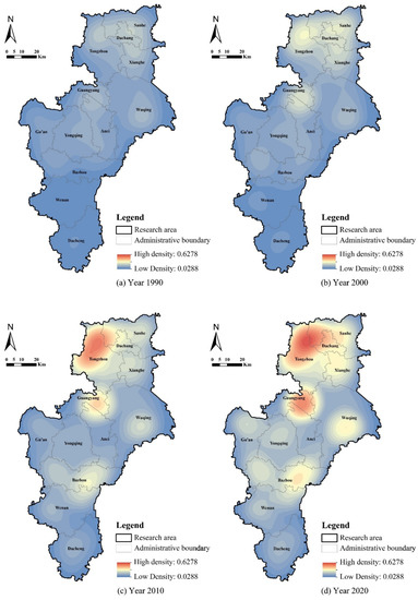 Kernel density analysis of construction land in the TWL region in (a) 1990, (b) 2000, (c) 2010, and (d) 2020 (Source: authors).