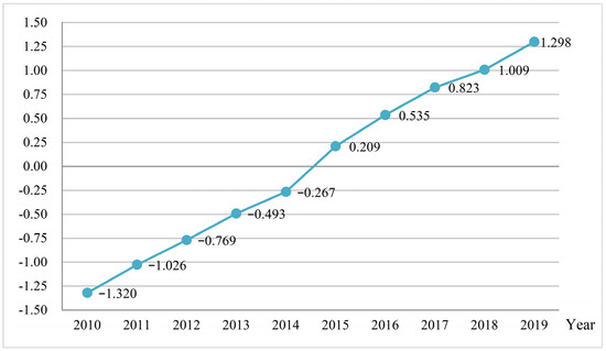 The comprehensive score of the driving force of construction LUC in the TWL region presents a balanced and stable trend of continuous increase from 2010–2019: it rises from −1.320 in 2010 to 1.298 in 2019, has the largest increase from 2014–2015, and then flattens out (Figure 5). This indicates the increasingly strong influence of the socioeconomic driving forces on construction LUC in the TWL region.