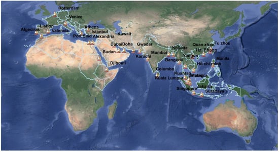- Zhao, C.; Wang, Y.; Gong, Y.; Brown, S.; Li, R. The evolution of the port network along the Maritime Silk Road: From a sustainable development perspective. Mar. Policy 2021, 126, 104426. [Google Scholar] [CrossRef]