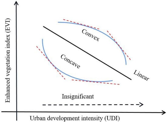 Typically, the EVI declined with an increasing UDI, which meant that the EVI in urban cores had the lowest value among the zones. However, the EVI decaying modes varied with cities [26,27], and a nonlinear relationship between the EVI and UDI usually occurred due to seasonal variation, climate change and human interference. In view of this, we applied three possible forms in this study to express the relationship between the EVI and UDI (EVI–UDI) according to Zhou et al. [25], called Linear, Convex and Concave, to distinguish the performance of the EVI among different cities. Linear tells us that the EVI decreased linearly with a rising UDI. Convex means a slight downward curve, that is, it shows that the EVI decreased obviously alongside an increasing UDI. However, the EVI declined with a small slope first, which was then followed by a faster decrease with an increasing UDI. This trend always occurs in the coastal cities with a higher EVI intensity for vegetation pixels in the exurban or suburban than those in rural zones. The opposite is Concave, suggesting a sharp decrease in EVI first; the EVI trend then deceases slightly (Figure 2). A Concave pattern reflects strong vegetation activities in rural areas.