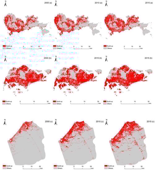Land-cover types common between all 35 coastal cities were classified into five classes (built-up, vegetation, water, bare land and others) using a random forest algorithm in the years 2000, 2010 and 2015. The accuracy assessment was performed for built-up areas based on Google Earth high-resolution images and a point-by-point verification approach. We generated 200 random verification points for each city and extracted corresponding points in land-cover maps; a confusion matrix was then used to evaluate the classification accuracy. For most coastal cities (60%, 21 out of 35), the kappa coefficients of urban built-up areas were greater than 0.90, and a few (10%) were lower than 0.70. The overall accuracy of the 35 coastal cities was 0.85, which met the accuracy requirement of land-use/cover change evaluation [29]. Coastal cities with high classification accuracy were mainly distributed in East Asia, Southeast Asia and South Asia, while coastal cities with low accuracy were mainly distributed in West Asia and Africa. This resulted from the fragmentation of built-up areas and the confused spectral features of unused land. Figure 3 shows the land-cover classifications of four representative coastal cities (Shenzhen, China; Singapore, Singapore; Dubai, United Arab Emirates; and Istanbul, Turkey) in the years of 2000, 2010 and 2015.