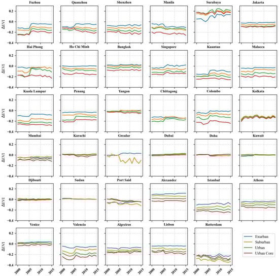As shown in Figure 4 and Table 2, the rural EVI and ΔEVI in four urban zones were analyzed using a linear regression model. The trends of the ΔEVI varied greatly among different coastal cities and urban zones between the years of 2000 and 2015. In most coastal cities, the ΔEVI in the four urban zones performed negatively, especially in urban and urban core zones, with low absolute values (ΔEVI) in exurban and high absolute values in urban core zones. However, Surabaya (Indonesia), Doha (Qatar), Kuwait (Kuwait) and Port Sudan (Sudan) displayed positive ΔEVI in urban and urban core zones and had no obvious reduction even in urban core zones (Table 2), which indicated better vegetation conditions in those zones than in rural zones for those cities. For Surabaya (Indonesia), we found that the built-up area increased between 2000 and 2015, calculated from the land-cover maps, accompanied with significantly rising grassland in urban and urban core zones.