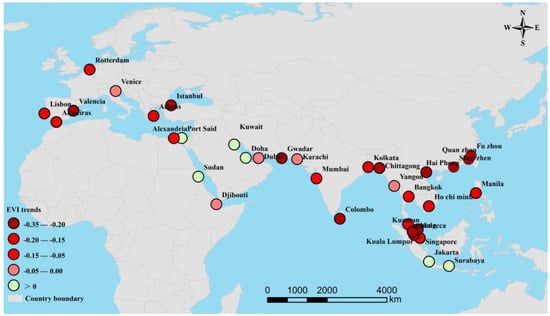Spatial distribution of the EVI trends of the 35 coastal cities during the period of 2000–2015.