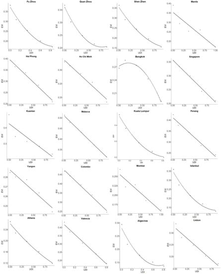Among the relationship between the EVI and UDI, linear models showed that the EVI linearly reduced alongside the increasing UDI in Asia. Urban development came at the direct price of losing agricultural land and foreshores, because many cities in Southeast Asia were dominated by paddy fields [46].