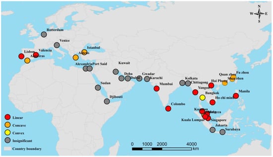 We classified the significant decreases in the EVI into three types: Linear, Concave and Convex (Figure 6 and Figure 7). Linear-type cities (12 cities along the MSR) were assembled in Southeast and South Asia (10 of 12 cities); a Concave type occurred in seven cities: Fuzhou, Quanzhou, Shenzhen, Istanbul, Athens and Algeciras; and only one coastal city (Bangkok) showed a Convex trend. EVI–UDI trends in 15 cities were statistically insignificant, which were mainly located in the western region of the MSR. Previous knowledge from Imhoff et al. [44] and Sun et al. [45] implies that insignificant changes in the EVI appear in a few dry cities where the urbanization is not too intense and that vegetation conditions improve because of human irrigation and cultivation of suitable plant species.