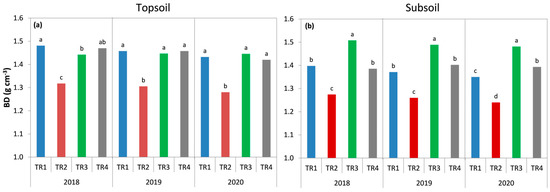 Bulk density (BD) in topsoil (10–20 cm) (a) and subsoil (40–50 cm) (b) as affected by different tillage systems during the three years of the Romanian experiment. Different letters represent statistically significant differences according to the Tukey post-hoc test at p < 0.05. TR1: mouldboard ploughing with furrow inversion to 25 cm depth; TR2: subsoiling to 60 cm + disking to 12 cm depth; TR3: control treatment with 2-times disking; TR4: chiselling to 25 cm depth with furrow inversion.