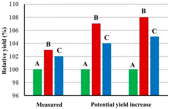 The measured relative winter wheat yield for the subsoiling (B) and subsoiling + straw (C) treatments compared to the control (A) in 2019 (left columns) at the Swedish site. Assuming that the whole (100%) subsoil was affected, and not only a portion of the subsoil surface (45%) or subsoil volume (38%), the potential yield increase is proportionally higher (middle and right columns).