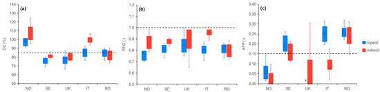 Box and whisker plots of degree of compactness (DC) (a), relative normalised density (RND) (b), and air-filled porosity (AFP) (c) in topsoil and subsoil at the five study sites. N: Norway; SE: Sweden; UK: United Kingdom; IT: Italy; RO: Romania. The box delimits values from low to high (from the 25th percentile to 75th percentile). Inside the box, the median and mean are indicated by a line and an X, respectively. The whiskers represent the minimum and maximum values in the range. * data not shown for the UK topsoil due to high frequencies of zero values.