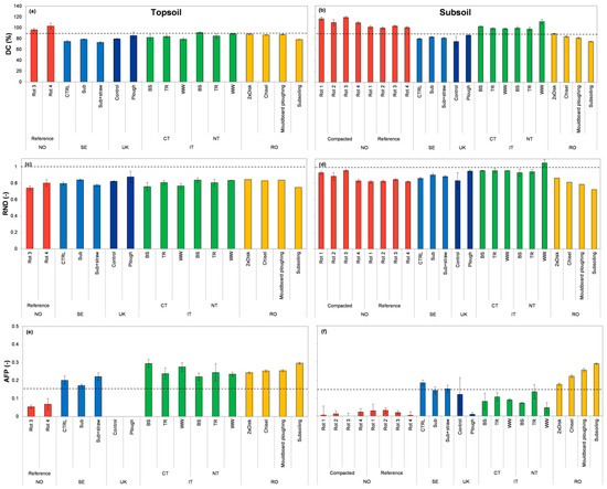 In compacted soils, the soil–root contact may be very close, and reduced porosity could result in reduced soil aeration [73]. Therefore, the AFP may also be a useful index to estimate the compaction impact on crop growth. Except for tolerant crops, the ideal AFP is in the 10–15% range [74]. In the present study, the AFP ranged from values close to zero in the UK and some of the Norwegian treatments to a maximum of 0.32 found at both the Italian and Romanian SSs (Figure 7c). Higher topsoil values compared to the subsoil were found at both the Norwegian (0.06 vs. 0.01) and Italian SSs (0.25 vs. 0.09), while small differences between the soil layers were found at the Swedish (0.18 on average) and Romanian SSs (0.25 on average) (Figure 7c). At the latter SS, the AFP was affected by the tillage treatments in both the topsoil and subsoil, following the opposite trend observed for the RND (Figure 8e,f). Lower values in the topsoil were associated with disking, chiselling, and ploughing (0.25 on average) compared to subsoiling (0.30), while the AFP values for the subsoil of the different treatments ranked as follows: subsoiling (0.29) > ploughing (0.25) > chiselling (0.22) > disking (0.18) (Figure 8e,f).