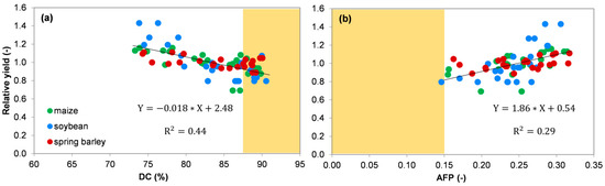 With the exception of the Romanian SS, there was no relationship (data not shown) between the crop yield and the SC indicators (i.e., DC, RND, AFP, and PR). At this SS, we found a 2% yield reduction for every percentage of DC increase or every unit of AFP decrease (Figure 9). This implies that in passing from a DC of 83% (average of Romanian soils) to 87% (DC limit for crop growth according to Håkansson [8]), a 7% reduction in the crop yield might be a possible scenario for this SS, irrespective of the crop type. The response of the crop yield to different levels of SC is usually considered parabolic, with low production in loosened soil, high yields at an optimal degree of soil compaction, and lower yields for compacted soils [77]. Only the descending part of this parabolic relationship may have been observed at the Romanian SS, and it is possible that the optimal DC for crop production in its fine-textured soil might be located at a DC lower than 87% [6].