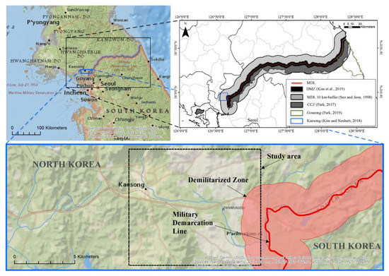 The war between South and North Korea is technically ongoing, with this tension exemplified across the Korean Demilitarized Zone (DMZ). The DMZ represents the buffer zone delineated along the inner border between South and North Korea (i.e., the military demarcation line (MDL)), and both sides must withdraw 2 km from the MDL. Although land change in the DMZ has been previously studied, few researchers have focused on the nearby metropolitan areas that are likely to substantially affect the DMZ’s landscape [18,19,20,21].