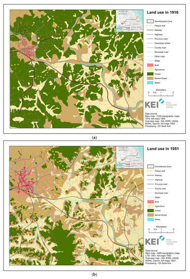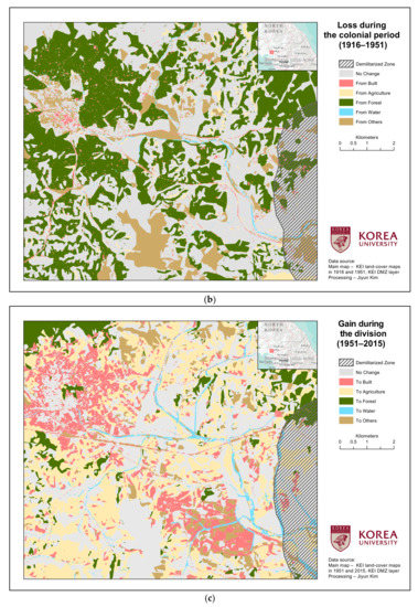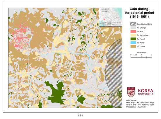 The three years selected for analysis—1916, 1951, and 2015—exemplify critical historical events in Kaesong (Figure 2a–c). The land-cover map of 1916 portrays the undisturbed landscape of Kaesong at the time of colonization by Imperial Japan in 1910, as the detailed land surveys, data processing, compilation, and finally publication (in 1916) all occurred several years before 1916. Similarly, the land-cover map of 1951 describes the region under which the two Koreas became independent, immediately prior to the Korean War-based damage to the landscape. Lastly, the land-cover map of 2015 represents the recent landscape during the South–North division. Accordingly, the study period has been divided into an earlier colonial period (1916–1951) and a latter division period (1951–2015) to be used as input for the intensity analysis. All land-cover maps for each of the three time-steps were previously published by the authors here [18].