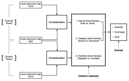 Intensity analyses allow researchers to identify LUCC at three different levels: (1) interval, (2) category, and (3) transition [25]. This assessment improves upon the typical change detection analysis, which identifies areas of change and no-change by comparing at least two land-cover maps from different points in time (i.e., two-way crosstabulation). Intensity analysis methodology does not only consider absolute change (area) but relative change (intensity) as well. Thus, when the three levels are explained in terms of both area and intensity, this framework allows for the acquisition of additional information. Once a measure of intensity is calculated, it is compared to an objective reference (i.e., uniform intensity) to indicate whether the corresponding LUCC is intensive or not [32]. That is, each level has at least one uniform intensity to conclude whether a LUCC is fast or slow (interval level), active or dormant (category level), and targeted or avoided (transition level). Our methodological flow is illustrated in Figure 3.