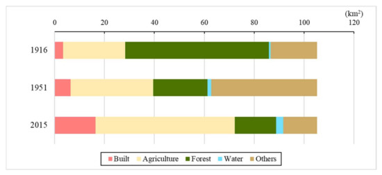 First, the areal changes of each category in 1916, 1951, and 2015 are explored. In the study area, Built, Agriculture, and Water continue to increase, whereas Forest continuously decreases from 1916 to 2015. Others shows a mixed pattern (Figure 4).