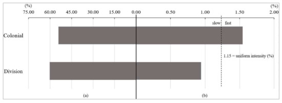 Category level change components in intensity during: (a) the colonial and (b) the division periods.