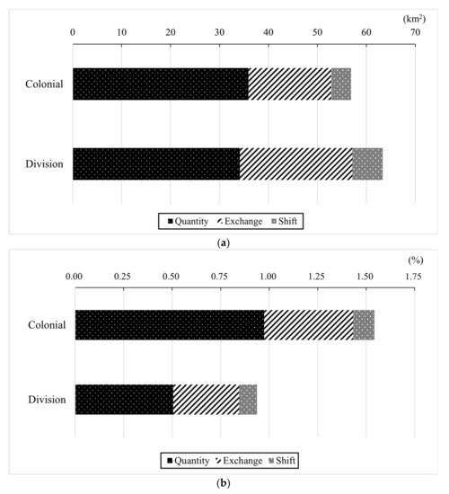 Category level change components in area during: (a) the colonial and (b) the division periods.