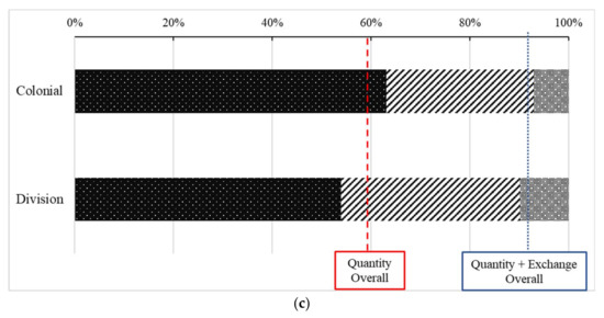 LUCCs in terms of area and intensity (Figure 6) are further decomposed into Quantity, Exchange, and Shift (Figure 7a–c). Quantity drives the majority of the LUCCs, followed by Exchange and Shift, regardless of the historical period being examined, thus indicating substantial LUCCs across both periods. As stated, the colonial period showed greater Quantity than the division period by total area (Figure 7a); however, when normalized to intensity, Quantity of the colonial period is two times larger (Figure 7b). Quantity Overall shows an identical pattern, where the landscape underwent more substantial changes during the colonial period (Figure 7c).