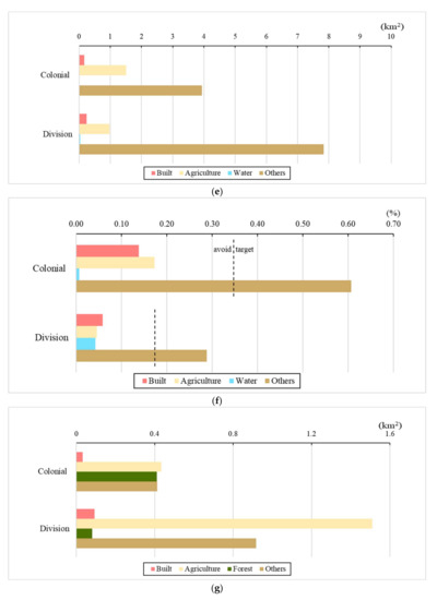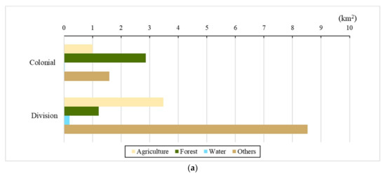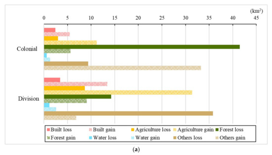 Among all land categories, Forest was the only net loss during colonization (Figure 8a). Consequently, the other land categories revealed net gain (Figure 8b; Table 2). Forest showed the largest loss (41.51 km2), whereas Others maintained the largest gain (33.29 km2; Figure 8a). Comparatively, the LUCCs of other categories were relatively minor, although Built and Agriculture indicated some gains. During the division period, Agriculture showed the most substantial gain (31.38 km2), followed by Built (13.42 km2), representing increased gains of 20.17 km2 and 7.94 km2 over the previous period, respectively. The Others class lost considerable area and gained little. Further, Forest loss during the division was less than that in the colonial period (Figure 8a).