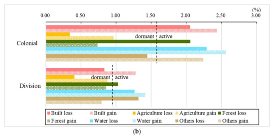 As mentioned, Forest loss during the division was smaller than that during the colonial period by area (Figure 8a). In terms of intensity, however, Forest loss during the division was not minor (i.e., the loss was active; Figure 8b). Agriculture gain shows the opposite pattern, where in terms of size, its gain was substantial (Figure 8a), but these changes were barely active in terms of intensity (Figure 8b). Water gain (1.41%) was still most active during the division, followed by Others loss (1.32%) and Built gain (1.28%). Water was the only category in which both gains and losses were active (Figure 8b).