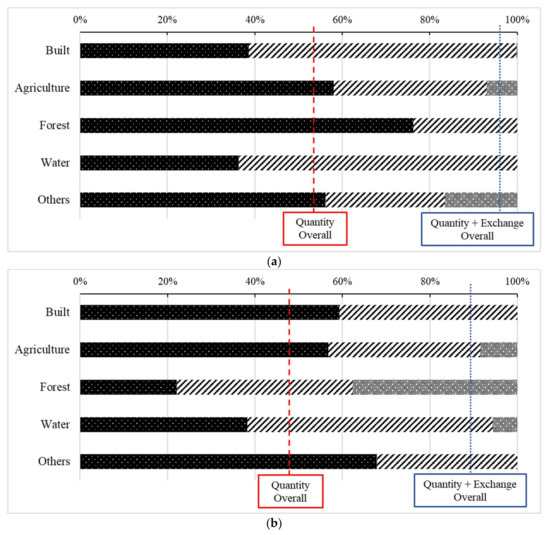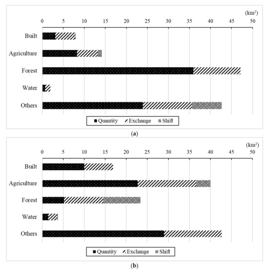 Lastly, “Shift” indicates the remaining disagreements, including changes among three or more categories. Accordingly, the overall LUCC is equivalent to the summation of Quantity, Exchange, and Shift [32,33]. In the present research, Quantity, Exchange, and Shift represent “substantial”, “moderate”, and “complex” LUCCs, respectively.