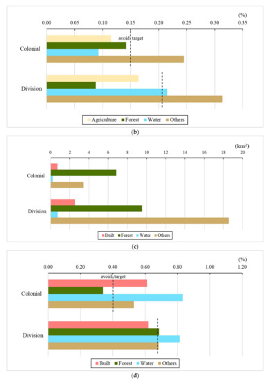 In the colonial period, Forest had the largest area converted to Built. However, in terms of intensity, only the Others category was targeted in the colonial period (Figure 11b), with Forest avoided. During the division, Others contributed the most to Built (Figure 11a), with a similar trend observed for intensity. Further, Water was also targeted by Built in terms of intensity (Figure 11b).
