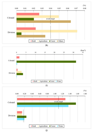 Agriculture targeted mostly Forest during the colonial period (Figure 11c), whereas, for intensity, Agriculture targeted all of the other land categories, except Forest (Figure 11d). During the division period, Agriculture targeted all but Built (Figure 11d), whereas the LUCC from the other categories to Agriculture is more notable among the transitions, being largely a result of greater area and intensity (Figure 11a–j).