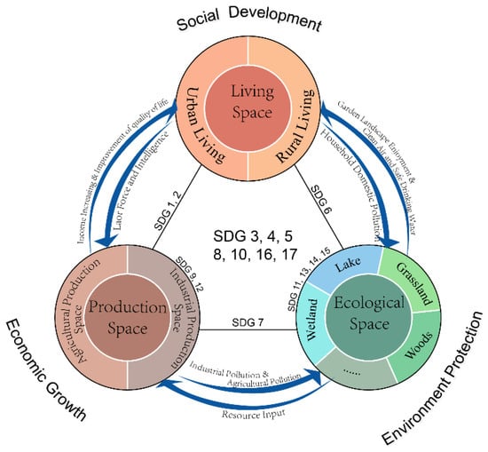 By 2020, China achieved the goal of eliminating poverty, which was accompanied by economic growth and rapid urbanization and contributed to SDG 1 [14,15]. Unfortunately, inconsistent and rough terrestrial land development patterns in production space and living space have placed pressure on ecological protection and resource security for ecological spaces [16,17,18,19]. To control the intensity of terrestrial land development and adjust the spatial structure, the concept of PLE (production–living–ecology) space was proposed in the report of the 18th National Congress of the Communist Party of China. The objective is to construct intensive and efficient production space, livable and appropriate living space, and protected and beautiful ecological space with beautiful mountains and clear water based on the principle of balancing economic, social, and ecological benefits. It aims to delimit the boundaries of multi-function terrestrial land development and establish a system for future sustainable land development [20]. To a certain extent, PLE space can be considered a combination of SDG indicators from a land function point of view (Figure 1). It is highly relevant to the 17 SDGs that involve environmental integrity, social equity, and economic prosperity, which comprise the triple bottom line approach of human wellbeing [21,22].