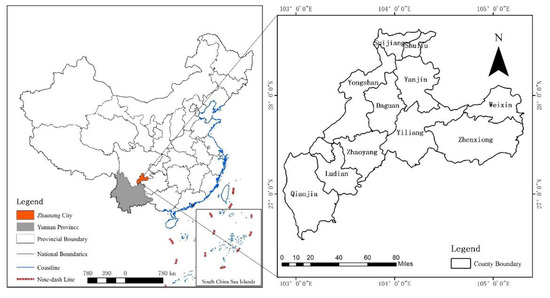 - Zhaotong Bureau of Statistics. Zhaotong Statistical Yearbook 2018; Zhaotong Bureau of Statistics: Zhaotong, China, 2018. [Google Scholar]