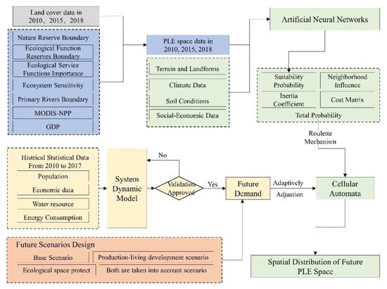 This paper aims to build an optimization model based on system dynamics and FLUS in which land resources can be planned quantitatively and spatially in terms of PLE space. A system dynamics model is employed to simulate the structure of the PLE space system and predict quantitative demand in 2030. FLUS is applied to allocate the land parcels at the spatial scale. The workflow is shown in Figure 3. The work consists of 4 main parts: