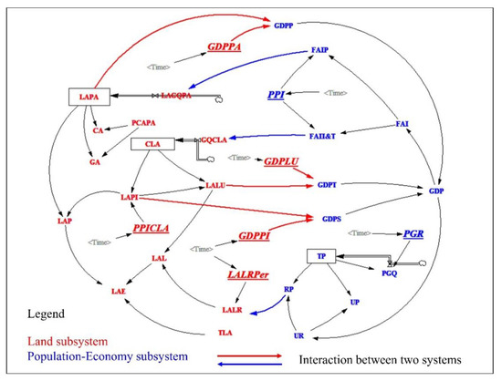 The structure optimization model of PLE space is realized by constructing the system dynamic model. First, it is necessary to clarify the system boundary and system structure. The system boundary affects the model’s complexity, and the boundary cannot be too large or too small. The system structure refers to the variables involved in the model and the relationship between them. The purpose of this research is to understand the interaction between the main elements in PLE space. Therefore, the system boundary was confined to Zhaotong from 2010 to 2017, and the model was constructed by selecting factors related to population, social fixed asset investment, regional GDP, land resources, and more. The PLE space system is divided into a population–economy subsystem and a land-use subsystem. According to data recorded by the Statistical Yearbook of Zhaotong and Statistical Bulletin of Zhaotong, 33 variables were finally selected. The system structure is shown in Figure 4. Specific variable names and units are detailed in Table S1 of the supplementary file.