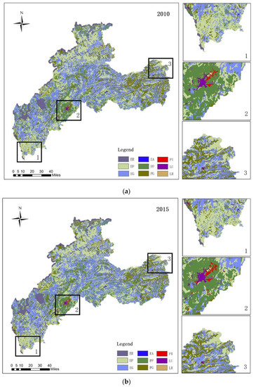 The spatial distribution of PLE spaces is shown in Figure 5. Restricted ecological space (ER) is mainly distributed in the western part of Zhaotong city, but it is more concentrated in the southwestern part. The priority ecological space (EP) is distributed in the south and northwest of the city. The general ecological space (EG) is more scattered. The area of accommodated ecological space (EA) is small. Priority agricultural production space (PP) is distributed in the city’s central part and is more concentrated and contiguous, while general agricultural production space (PG) is in the northeastern part. In addition, industrial production space (PI), urban living space (LU), and rural living space (LR) are more scattered.